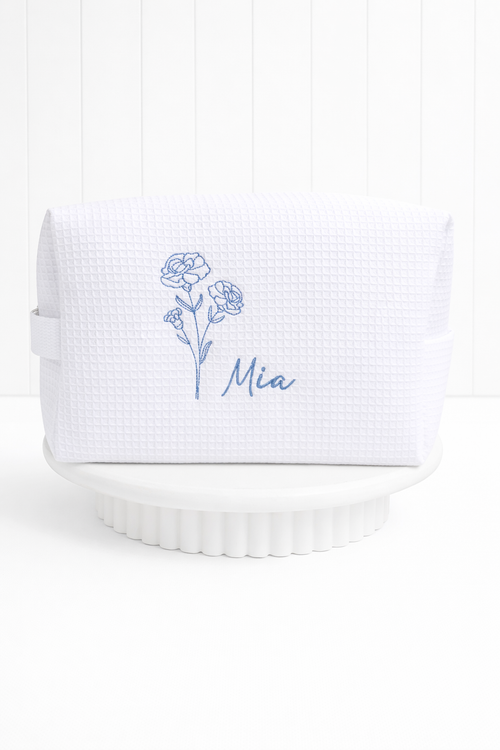Personalized, custom White Waffle Make Up Bag, birthday flower, birthday gift, bridesmaid gift